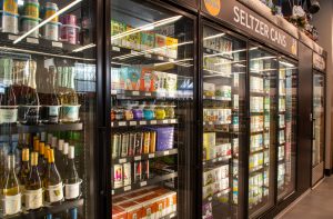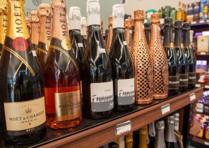 In an adjoining space, the South Cairo Liquor Store offers a wide selection of wines, spirits, and ready-to-drink beverages, with wines organized by variety and chilled selections available in front-access coolers.